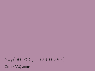 Yxy 30.766,0.329,0.293 Color is a light magenta color and the nearest color is Opera Mauve #b784a7. Hex code #b38ba5 and RGB value is rgb(179,139,165). In RGB color space, this color is composed of 70% red, 55% green, 65% blue, In CMYK color space, this color is composed of 0% cyan, 22% magenta, 8% yellow , 30% black , In HSL color space, this color has a hue angle of 321° , 21% saturation and 62% lightness.