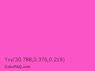 Yxy 30.788,0.376,0.219 Color is a light magenta color and the nearest color is Light Deep Pink #ff5ccd. Hex code #fa54c7 and RGB value is rgb(250,84,199). In RGB color space, this color is composed of 98% red, 33% green, 78% blue, In CMYK color space, this color is composed of 0% cyan, 66% magenta, 20% yellow , 2% black , In HSL color space, this color has a hue angle of 318° , 94% saturation and 65% lightness.