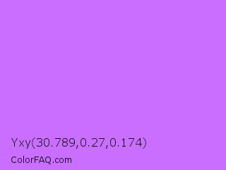 Yxy 30.789,0.27,0.174 Color is a light purple color and the nearest color is Heliotrope #df73ff. Hex code #c96eff and RGB value is rgb(201,110,255). In RGB color space, this color is composed of 79% red, 43% green, 100% blue, In CMYK color space, this color is composed of 21% cyan, 57% magenta, 0% yellow , 0% black , In HSL color space, this color has a hue angle of 278° , 100% saturation and 72% lightness.