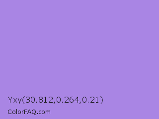 Yxy 30.812,0.264,0.21 Color is a light violet color and the nearest color is Lavender #b57edc. Hex code #a985e4 and RGB value is rgb(169,133,228). In RGB color space, this color is composed of 66% red, 52% green, 89% blue, In CMYK color space, this color is composed of 26% cyan, 42% magenta, 0% yellow , 11% black , In HSL color space, this color has a hue angle of 263° , 64% saturation and 71% lightness.