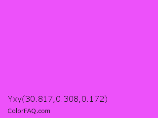 Yxy 30.817,0.308,0.172 Color is a light magenta color and the nearest color is Pink Flamingo Crayola #ff66ff. Hex code #ed51fa and RGB value is rgb(237,81,250). In RGB color space, this color is composed of 93% red, 32% green, 98% blue, In CMYK color space, this color is composed of 5% cyan, 68% magenta, 0% yellow , 2% black , In HSL color space, this color has a hue angle of 295° , 94% saturation and 65% lightness.