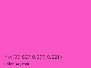 Yxy 30.827,0.377,0.221 Color is a light magenta color and the nearest color is Light Deep Pink #ff5ccd. Hex code #f955c5 and RGB value is rgb(249,85,197). In RGB color space, this color is composed of 98% red, 33% green, 77% blue, In CMYK color space, this color is composed of 0% cyan, 66% magenta, 21% yellow , 2% black , In HSL color space, this color has a hue angle of 319° , 93% saturation and 65% lightness.