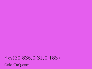Yxy 30.836,0.31,0.185 Color is a light magenta color and the nearest color is Heliotrope #df73ff. Hex code #e55eee and RGB value is rgb(229,94,238). In RGB color space, this color is composed of 90% red, 37% green, 93% blue, In CMYK color space, this color is composed of 4% cyan, 61% magenta, 0% yellow , 7% black , In HSL color space, this color has a hue angle of 296° , 81% saturation and 65% lightness.