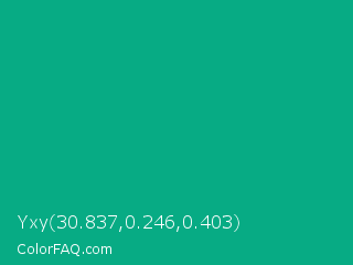 Yxy 30.837,0.246,0.403 Color is a normal cyan color and the nearest color is Niagara #06a189. Hex code #07ab84 and RGB value is rgb(7,171,132). In RGB color space, this color is composed of 3% red, 67% green, 52% blue, In CMYK color space, this color is composed of 96% cyan, 0% magenta, 23% yellow , 33% black , In HSL color space, this color has a hue angle of 166° , 92% saturation and 35% lightness.