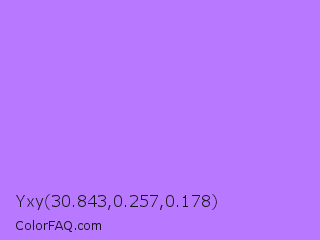 Yxy 30.843,0.257,0.178 Color is a light violet color and the nearest color is Lavender #b57edc. Hex code #b878ff and RGB value is rgb(184,120,255). In RGB color space, this color is composed of 72% red, 47% green, 100% blue, In CMYK color space, this color is composed of 28% cyan, 53% magenta, 0% yellow , 0% black , In HSL color space, this color has a hue angle of 268° , 100% saturation and 74% lightness.
