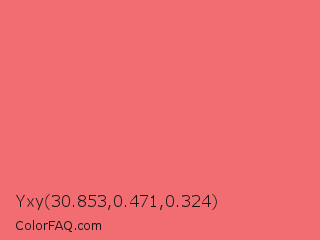 Yxy 30.853,0.471,0.324 Color is a light red color and the nearest color is Begonia #fa6e79. Hex code #f16d72 and RGB value is rgb(241,109,114). In RGB color space, this color is composed of 95% red, 43% green, 45% blue, In CMYK color space, this color is composed of 0% cyan, 55% magenta, 53% yellow , 5% black , In HSL color space, this color has a hue angle of 358° , 83% saturation and 69% lightness.