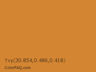 Yxy 30.854,0.486,0.418 Color is a normal orange color and the nearest color is Bronze #cd7f32. Hex code #d38532 and RGB value is rgb(211,133,50). In RGB color space, this color is composed of 83% red, 52% green, 20% blue, In CMYK color space, this color is composed of 0% cyan, 37% magenta, 76% yellow , 17% black , In HSL color space, this color has a hue angle of 31° , 65% saturation and 51% lightness.
