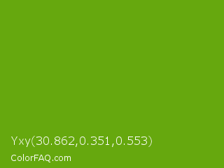 Yxy 30.862,0.351,0.553 Color is a normal green color and the nearest color is Christi #67a712. Hex code #66a80e and RGB value is rgb(102,168,14). In RGB color space, this color is composed of 40% red, 66% green, 5% blue, In CMYK color space, this color is composed of 39% cyan, 0% magenta, 92% yellow , 34% black , In HSL color space, this color has a hue angle of 86° , 85% saturation and 36% lightness.