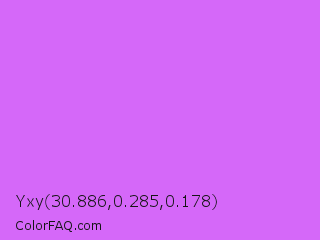 Yxy 30.886,0.285,0.178 Color is a light purple color and the nearest color is Heliotrope #df73ff. Hex code #d568f9 and RGB value is rgb(213,104,249). In RGB color space, this color is composed of 84% red, 41% green, 98% blue, In CMYK color space, this color is composed of 14% cyan, 58% magenta, 0% yellow , 2% black , In HSL color space, this color has a hue angle of 285° , 92% saturation and 69% lightness.
