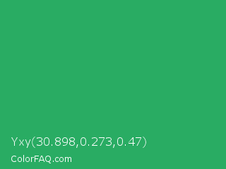 Yxy 30.898,0.273,0.47 Color is a normal green color and the nearest color is Chateau Green #40a860. Hex code #29ac63 and RGB value is rgb(41,172,99). In RGB color space, this color is composed of 16% red, 67% green, 39% blue, In CMYK color space, this color is composed of 76% cyan, 0% magenta, 42% yellow , 33% black , In HSL color space, this color has a hue angle of 147° , 62% saturation and 42% lightness.