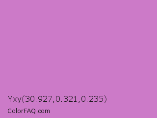 Yxy 30.927,0.321,0.235 Color is a light magenta color and the nearest color is French Mauve #d473d4. Hex code #cc7ac8 and RGB value is rgb(204,122,200). In RGB color space, this color is composed of 80% red, 48% green, 78% blue, In CMYK color space, this color is composed of 0% cyan, 40% magenta, 2% yellow , 20% black , In HSL color space, this color has a hue angle of 303° , 45% saturation and 64% lightness.