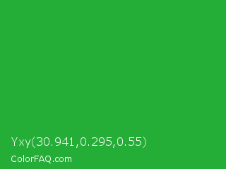 Yxy 30.941,0.295,0.55 Color is a normal green color and the nearest color is Wageningen Green #34b233. Hex code #25ae37 and RGB value is rgb(37,174,55). In RGB color space, this color is composed of 15% red, 68% green, 22% blue, In CMYK color space, this color is composed of 79% cyan, 0% magenta, 68% yellow , 32% black , In HSL color space, this color has a hue angle of 128° , 65% saturation and 41% lightness.