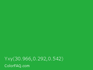 Yxy 30.966,0.292,0.542 Color is a normal green color and the nearest color is Wageningen Green #34b233. Hex code #24ae3d and RGB value is rgb(36,174,61). In RGB color space, this color is composed of 14% red, 68% green, 24% blue, In CMYK color space, this color is composed of 79% cyan, 0% magenta, 65% yellow , 32% black , In HSL color space, this color has a hue angle of 131° , 66% saturation and 41% lightness.