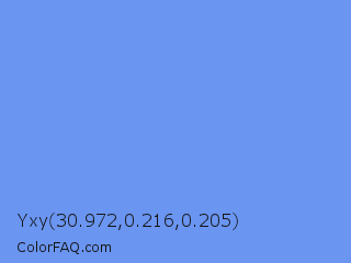 Yxy 30.972,0.216,0.205 Color is a light blue color and the nearest color is Cornflower Blue #6495ed. Hex code #6a95f1 and RGB value is rgb(106,149,241). In RGB color space, this color is composed of 42% red, 58% green, 95% blue, In CMYK color space, this color is composed of 56% cyan, 38% magenta, 0% yellow , 5% black , In HSL color space, this color has a hue angle of 221° , 83% saturation and 68% lightness.