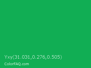 Yxy 31.031,0.276,0.505 Color is a normal green color and the nearest color is Green Pigment #00a550. Hex code #11ae54 and RGB value is rgb(17,174,84). In RGB color space, this color is composed of 7% red, 68% green, 33% blue, In CMYK color space, this color is composed of 90% cyan, 0% magenta, 52% yellow , 32% black , In HSL color space, this color has a hue angle of 146° , 82% saturation and 37% lightness.