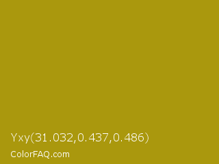 Yxy 31.032,0.437,0.486 Color is a normal yellow color and the nearest color is Lucky #af9f1c. Hex code #aa980d and RGB value is rgb(170,152,13). In RGB color space, this color is composed of 67% red, 60% green, 5% blue, In CMYK color space, this color is composed of 0% cyan, 11% magenta, 92% yellow , 33% black , In HSL color space, this color has a hue angle of 53° , 86% saturation and 36% lightness.