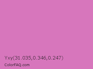 Yxy 31.035,0.346,0.247 Color is a light magenta color and the nearest color is Middle Purple #d982b5. Hex code #d776bc and RGB value is rgb(215,118,188). In RGB color space, this color is composed of 84% red, 46% green, 74% blue, In CMYK color space, this color is composed of 0% cyan, 45% magenta, 13% yellow , 16% black , In HSL color space, this color has a hue angle of 317° , 55% saturation and 65% lightness.
