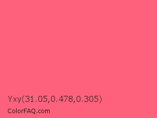 Yxy 31.05,0.478,0.305 Color is a light red color and the nearest color is Brink Pink #fb607f. Hex code #fe617b and RGB value is rgb(254,97,123). In RGB color space, this color is composed of 100% red, 38% green, 48% blue, In CMYK color space, this color is composed of 0% cyan, 62% magenta, 52% yellow , 0% black , In HSL color space, this color has a hue angle of 350° , 99% saturation and 69% lightness.