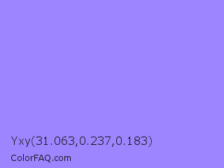 Yxy 31.063,0.237,0.183 Color is a light indigo color and the nearest color is Dull Lavender #a899e6. Hex code #9d85ff and RGB value is rgb(157,133,255). In RGB color space, this color is composed of 62% red, 52% green, 100% blue, In CMYK color space, this color is composed of 38% cyan, 48% magenta, 0% yellow , 0% black , In HSL color space, this color has a hue angle of 252° , 100% saturation and 76% lightness.