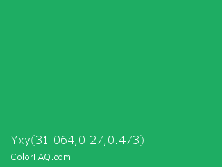 Yxy 31.064,0.27,0.473 Color is a normal green color and the nearest color is Green Crayola #1cac78. Hex code #1ead63 and RGB value is rgb(30,173,99). In RGB color space, this color is composed of 12% red, 68% green, 39% blue, In CMYK color space, this color is composed of 83% cyan, 0% magenta, 43% yellow , 32% black , In HSL color space, this color has a hue angle of 149° , 70% saturation and 40% lightness.