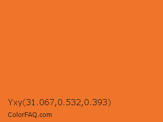 Yxy 31.067,0.532,0.393 Color is a normal orange color and the nearest color is Vivid Tangelo #f07427. Hex code #ee752a and RGB value is rgb(238,117,42). In RGB color space, this color is composed of 93% red, 46% green, 16% blue, In CMYK color space, this color is composed of 0% cyan, 51% magenta, 82% yellow , 7% black , In HSL color space, this color has a hue angle of 23° , 85% saturation and 55% lightness.