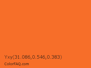 Yxy 31.086,0.546,0.383 Color is a normal orange color and the nearest color is Vivid Tangelo #f07427. Hex code #f76e29 and RGB value is rgb(247,110,41). In RGB color space, this color is composed of 97% red, 43% green, 16% blue, In CMYK color space, this color is composed of 0% cyan, 55% magenta, 83% yellow , 3% black , In HSL color space, this color has a hue angle of 20° , 93% saturation and 56% lightness.