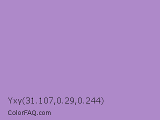 Yxy 31.107,0.29,0.244 Color is a light purple color and the nearest color is East Side #ac91ce. Hex code #ae89c9 and RGB value is rgb(174,137,201). In RGB color space, this color is composed of 68% red, 54% green, 79% blue, In CMYK color space, this color is composed of 13% cyan, 32% magenta, 0% yellow , 21% black , In HSL color space, this color has a hue angle of 275° , 37% saturation and 66% lightness.