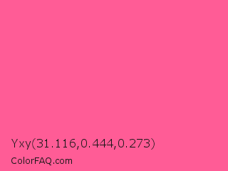 Yxy 31.116,0.444,0.273 Color is a light rose color and the nearest color is Strawberry #fc5a8d. Hex code #ff5c96 and RGB value is rgb(255,92,150). In RGB color space, this color is composed of 100% red, 36% green, 59% blue, In CMYK color space, this color is composed of 0% cyan, 64% magenta, 41% yellow , 0% black , In HSL color space, this color has a hue angle of 339° , 100% saturation and 68% lightness.