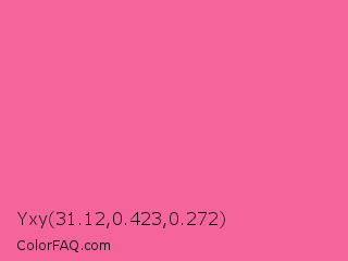 Yxy 31.12,0.423,0.272 Color is a light rose color and the nearest color is French Pink #fd6c9e. Hex code #f5659c and RGB value is rgb(245,101,156). In RGB color space, this color is composed of 96% red, 40% green, 61% blue, In CMYK color space, this color is composed of 0% cyan, 59% magenta, 36% yellow , 4% black , In HSL color space, this color has a hue angle of 337° , 88% saturation and 68% lightness.