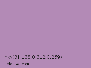 Yxy 31.138,0.312,0.269 Color is a light magenta color and the nearest color is African Violet #b284be. Hex code #b38ab6 and RGB value is rgb(179,138,182). In RGB color space, this color is composed of 70% red, 54% green, 71% blue, In CMYK color space, this color is composed of 2% cyan, 24% magenta, 0% yellow , 29% black , In HSL color space, this color has a hue angle of 296° , 23% saturation and 63% lightness.