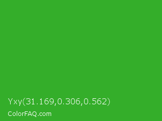 Yxy 31.169,0.306,0.562 Color is a normal green color and the nearest color is Wageningen Green #34b233. Hex code #34ae2a and RGB value is rgb(52,174,42). In RGB color space, this color is composed of 20% red, 68% green, 16% blue, In CMYK color space, this color is composed of 70% cyan, 0% magenta, 76% yellow , 32% black , In HSL color space, this color has a hue angle of 115° , 61% saturation and 42% lightness.