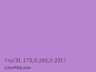 Yxy 31.173,0.292,0.231 Color is a light purple color and the nearest color is Lavender #b57edc. Hex code #b884d1 and RGB value is rgb(184,132,209). In RGB color space, this color is composed of 72% red, 52% green, 82% blue, In CMYK color space, this color is composed of 12% cyan, 37% magenta, 0% yellow , 18% black , In HSL color space, this color has a hue angle of 281° , 46% saturation and 67% lightness.