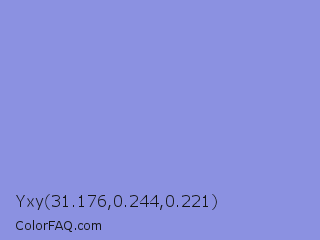 Yxy 31.176,0.244,0.221 Color is a light blue color and the nearest color is Chetwode Blue #8581d9. Hex code #8b91e1 and RGB value is rgb(139,145,225). In RGB color space, this color is composed of 55% red, 57% green, 88% blue, In CMYK color space, this color is composed of 38% cyan, 36% magenta, 0% yellow , 12% black , In HSL color space, this color has a hue angle of 236° , 59% saturation and 71% lightness.