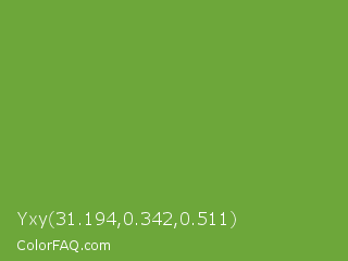 Yxy 31.194,0.342,0.511 Color is a normal green color and the nearest color is Green RYB #66b032. Hex code #6da73a and RGB value is rgb(109,167,58). In RGB color space, this color is composed of 43% red, 65% green, 23% blue, In CMYK color space, this color is composed of 35% cyan, 0% magenta, 65% yellow , 35% black , In HSL color space, this color has a hue angle of 92° , 48% saturation and 44% lightness.