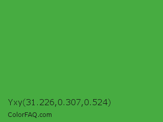 Yxy 31.226,0.307,0.524 Color is a normal green color and the nearest color is Apple #4fa83d. Hex code #47ac41 and RGB value is rgb(71,172,65). In RGB color space, this color is composed of 28% red, 67% green, 25% blue, In CMYK color space, this color is composed of 59% cyan, 0% magenta, 62% yellow , 33% black , In HSL color space, this color has a hue angle of 117° , 45% saturation and 46% lightness.