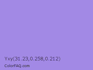 Yxy 31.23,0.258,0.212 Color is a light indigo color and the nearest color is Dull Lavender #a899e6. Hex code #a289e5 and RGB value is rgb(162,137,229). In RGB color space, this color is composed of 64% red, 54% green, 90% blue, In CMYK color space, this color is composed of 29% cyan, 40% magenta, 0% yellow , 10% black , In HSL color space, this color has a hue angle of 256° , 64% saturation and 72% lightness.