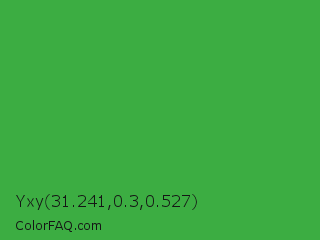 Yxy 31.241,0.3,0.527 Color is a normal green color and the nearest color is Wageningen Green #34b233. Hex code #3cad42 and RGB value is rgb(60,173,66). In RGB color space, this color is composed of 24% red, 68% green, 26% blue, In CMYK color space, this color is composed of 65% cyan, 0% magenta, 62% yellow , 32% black , In HSL color space, this color has a hue angle of 123° , 48% saturation and 46% lightness.