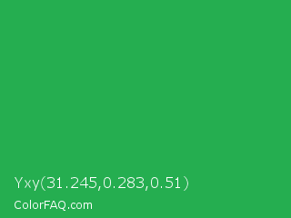 Yxy 31.245,0.283,0.51 Color is a normal green color and the nearest color is Chateau Green #40a860. Hex code #25ae50 and RGB value is rgb(37,174,80). In RGB color space, this color is composed of 15% red, 68% green, 31% blue, In CMYK color space, this color is composed of 79% cyan, 0% magenta, 54% yellow , 32% black , In HSL color space, this color has a hue angle of 139° , 65% saturation and 41% lightness.