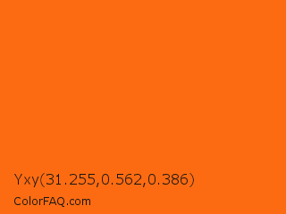 Yxy 31.255,0.562,0.386 Color is a normal orange color and the nearest color is Pumpkin #ff7518. Hex code #fc6b12 and RGB value is rgb(252,107,18). In RGB color space, this color is composed of 99% red, 42% green, 7% blue, In CMYK color space, this color is composed of 0% cyan, 58% magenta, 93% yellow , 1% black , In HSL color space, this color has a hue angle of 23° , 98% saturation and 53% lightness.