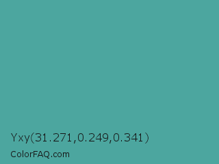 Yxy 31.271,0.249,0.341 Color is a normal cyan color and the nearest color is Breaker Bay #5da19f. Hex code #4ca69f and RGB value is rgb(76,166,159). In RGB color space, this color is composed of 30% red, 65% green, 62% blue, In CMYK color space, this color is composed of 54% cyan, 0% magenta, 4% yellow , 35% black , In HSL color space, this color has a hue angle of 175° , 37% saturation and 47% lightness.