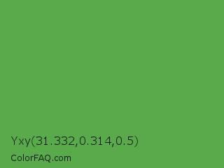 Yxy 31.332,0.314,0.5 Color is a normal green color and the nearest color is Apple #4fa83d. Hex code #58aa4b and RGB value is rgb(88,170,75). In RGB color space, this color is composed of 35% red, 67% green, 29% blue, In CMYK color space, this color is composed of 48% cyan, 0% magenta, 56% yellow , 33% black , In HSL color space, this color has a hue angle of 112° , 39% saturation and 48% lightness.