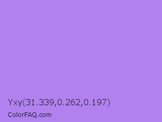 Yxy 31.339,0.262,0.197 Color is a light violet color and the nearest color is Lavender #b57edc. Hex code #b181f0 and RGB value is rgb(177,129,240). In RGB color space, this color is composed of 69% red, 51% green, 94% blue, In CMYK color space, this color is composed of 26% cyan, 46% magenta, 0% yellow , 6% black , In HSL color space, this color has a hue angle of 266° , 79% saturation and 72% lightness.