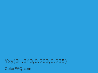 Yxy 31.343,0.203,0.235 Color is a normal blue color and the nearest color is Button Blue #24a0ed. Hex code #29a1e0 and RGB value is rgb(41,161,224). In RGB color space, this color is composed of 16% red, 63% green, 88% blue, In CMYK color space, this color is composed of 82% cyan, 28% magenta, 0% yellow , 12% black , In HSL color space, this color has a hue angle of 201° , 75% saturation and 52% lightness.
