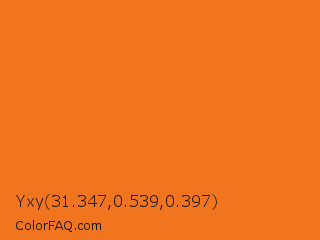 Yxy 31.347,0.539,0.397 Color is a normal orange color and the nearest color is Tango #ed7a1c. Hex code #f0751e and RGB value is rgb(240,117,30). In RGB color space, this color is composed of 94% red, 46% green, 12% blue, In CMYK color space, this color is composed of 0% cyan, 51% magenta, 88% yellow , 6% black , In HSL color space, this color has a hue angle of 25° , 88% saturation and 53% lightness.