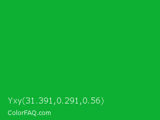 Yxy 31.391,0.291,0.56 Color is a normal green color and the nearest color is Dark Pastel Green #03c03c. Hex code #0eb033 and RGB value is rgb(14,176,51). In RGB color space, this color is composed of 5% red, 69% green, 20% blue, In CMYK color space, this color is composed of 92% cyan, 0% magenta, 71% yellow , 31% black , In HSL color space, this color has a hue angle of 134° , 85% saturation and 37% lightness.