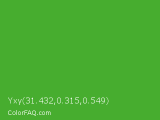Yxy 31.432,0.315,0.549 Color is a normal green color and the nearest color is Apple #4fa83d. Hex code #47ad2f and RGB value is rgb(71,173,47). In RGB color space, this color is composed of 28% red, 68% green, 18% blue, In CMYK color space, this color is composed of 59% cyan, 0% magenta, 73% yellow , 32% black , In HSL color space, this color has a hue angle of 109° , 57% saturation and 43% lightness.