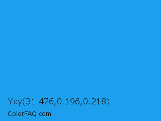 Yxy 31.476,0.196,0.218 Color is a normal blue color and the nearest color is Button Blue #24a0ed. Hex code #1ca0ed and RGB value is rgb(28,160,237). In RGB color space, this color is composed of 11% red, 63% green, 93% blue, In CMYK color space, this color is composed of 88% cyan, 32% magenta, 0% yellow , 7% black , In HSL color space, this color has a hue angle of 202° , 85% saturation and 52% lightness.
