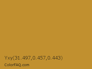 Yxy 31.497,0.457,0.443 Color is a normal orange color and the nearest color is Marigold #b98d28. Hex code #c1902f and RGB value is rgb(193,144,47). In RGB color space, this color is composed of 76% red, 56% green, 18% blue, In CMYK color space, this color is composed of 0% cyan, 25% magenta, 76% yellow , 24% black , In HSL color space, this color has a hue angle of 40° , 61% saturation and 47% lightness.