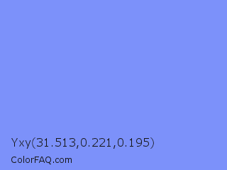 Yxy 31.513,0.221,0.195 Color is a light blue color and the nearest color is Portage #8b9fee. Hex code #7c91fa and RGB value is rgb(124,145,250). In RGB color space, this color is composed of 49% red, 57% green, 98% blue, In CMYK color space, this color is composed of 50% cyan, 42% magenta, 0% yellow , 2% black , In HSL color space, this color has a hue angle of 230° , 93% saturation and 73% lightness.