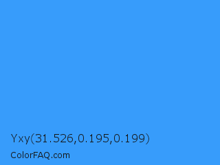 Yxy 31.526,0.195,0.199 Color is a normal blue color and the nearest color is Brilliant Azure #3399ff. Hex code #379cfb and RGB value is rgb(55,156,251). In RGB color space, this color is composed of 22% red, 61% green, 98% blue, In CMYK color space, this color is composed of 78% cyan, 38% magenta, 0% yellow , 2% black , In HSL color space, this color has a hue angle of 209° , 96% saturation and 60% lightness.